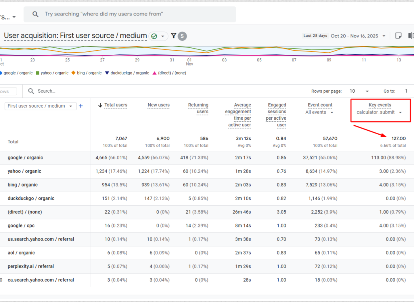 As you can see in the Google Analytics path exploration below, people discover the tool both organically and through the blog. The 138 represents the number of calculator “report” downloads in the last 28 days (Oct 20th – Nov 16th, 2025).